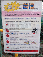 たまらず工場を離れて近くをうろうろしてみると、町内会の掲示板などに苦情の連絡先が貼りだされているのを見つけました。カラスの被害まであるんだ…。